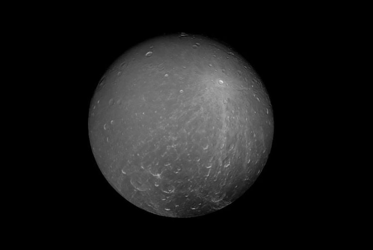 Поверхность Дионы, 1123-километрового спутника Сатурна, поражает контрастами – темные древние области соседствуют с относительно молодыми яркими серо-белыми участками. Эти светлые регионы представляют собой чистый водяной лед, обнаженный метеоритными ударами и тектонической активностью.